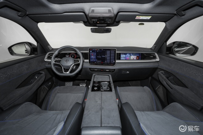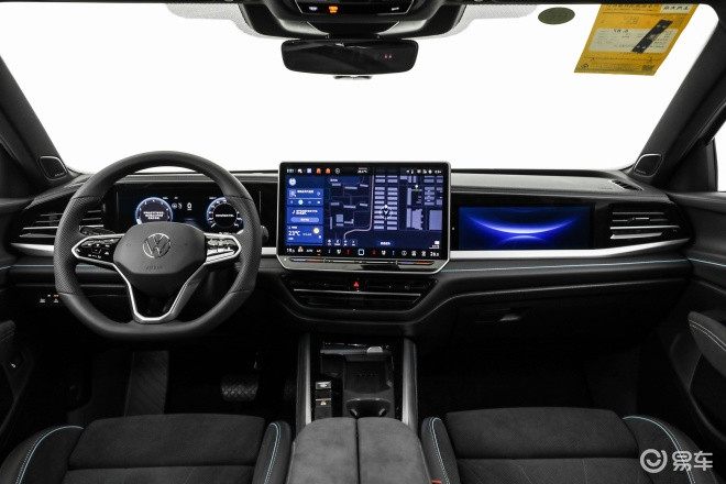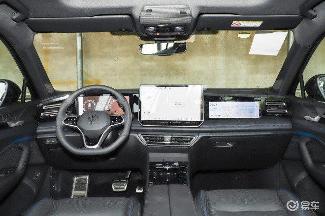 内饰方面,新车内饰采用大面积的翻毛皮材质,蓝色的风险装饰,中控台银色装饰修边,车内配备三块屏,仪表屏和副驾屏镶嵌在中控台内,中控屏为悬浮式设计,支持CarPlay、CarLife、HiCar手机互联,新车还引入了哈曼卡顿品牌音响。