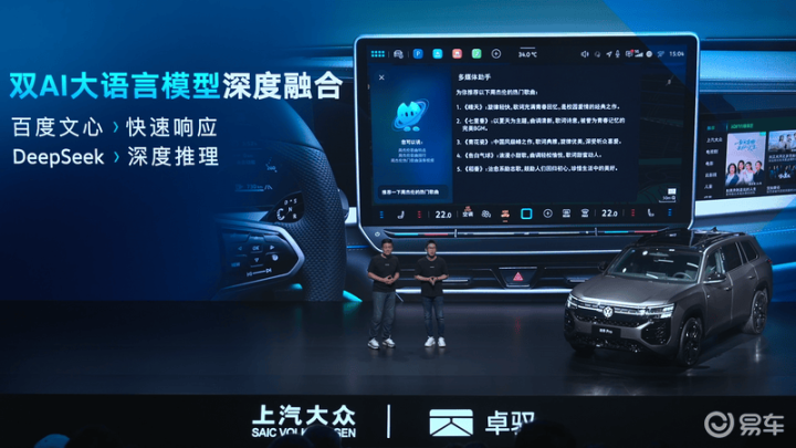 上汽大众与百度深度合作,实现百度文心+DeepSeek双AI大模型的深度融合,集内容生成和逻辑推理于一身,简单需求快速响应,复杂问题深度思考。与全新智能座舱语音助手深度融合,具备全场景交互能力:车主可以通过唤醒语音和AI大模型进行对话,能够充分理解车主的意图,迅速提供精准的答复。